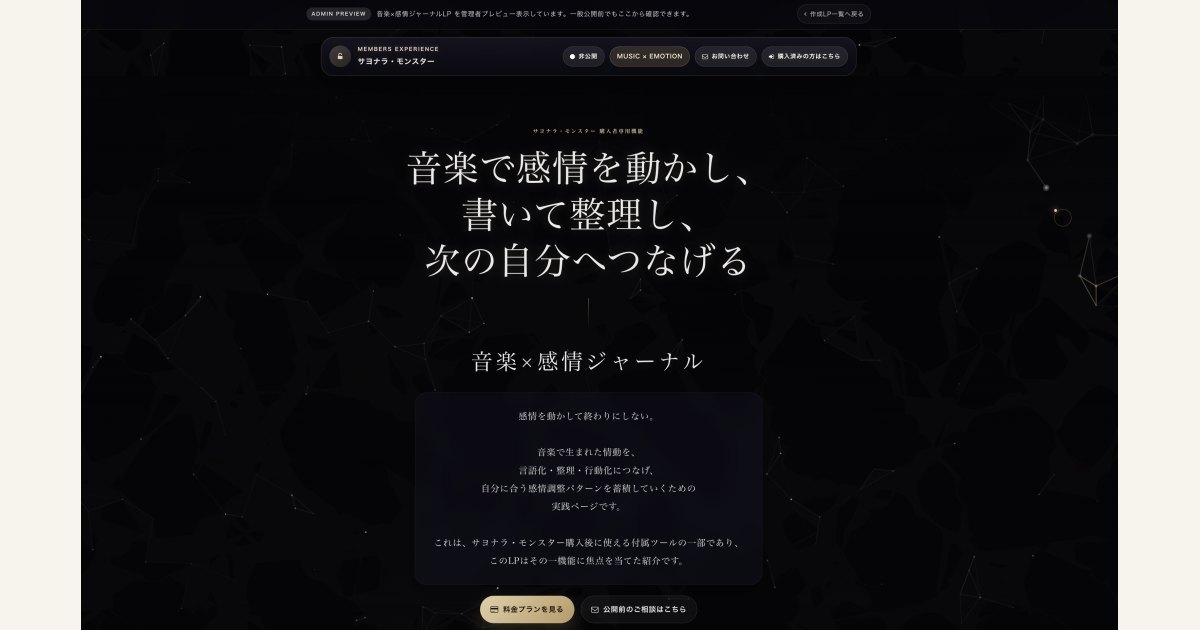 いいえ。このLPは音楽×感情ジャーナルに焦点を当てていますが、実際の購入対象はサヨナラ・モンスターの購入者専用サイト全体です。書く導線、管理、AI整理、補助導線も含めて使えます。