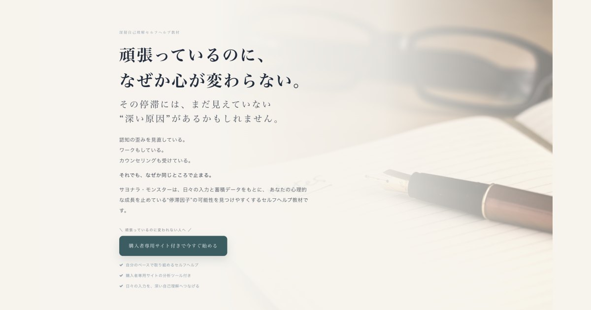 サヨナラ・モンスターは、日々の入力と蓄積データをもとに、 あなたの心理的な成長を止めている“停滞因子”の可能性を見つけやすくするセルフヘルプ教材です。